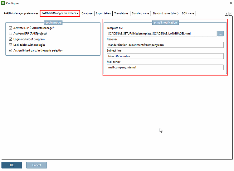 Selezionare la scheda Impostazioni di PARTdataManager [PARTdataManager preferences].