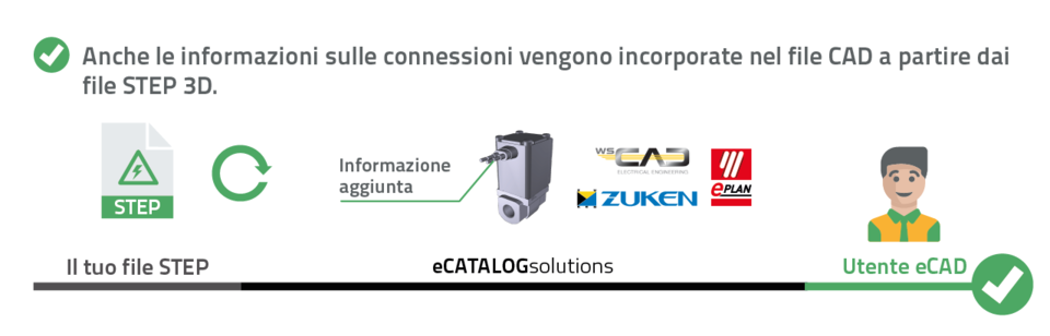 Nel ramo dell‘ingegneria elettrica, non è significativo soltanto il dato geometrico 3D di un componente: infatti, quando scelgono un componente, gli ingegneri hanno bisogno di tutte le informazioni tecniche aggiuntive come i collegamenti, le certificazioni ambientali (ad esempio: RoHS, REACH), il fine vita, la manutenzione, ecc.