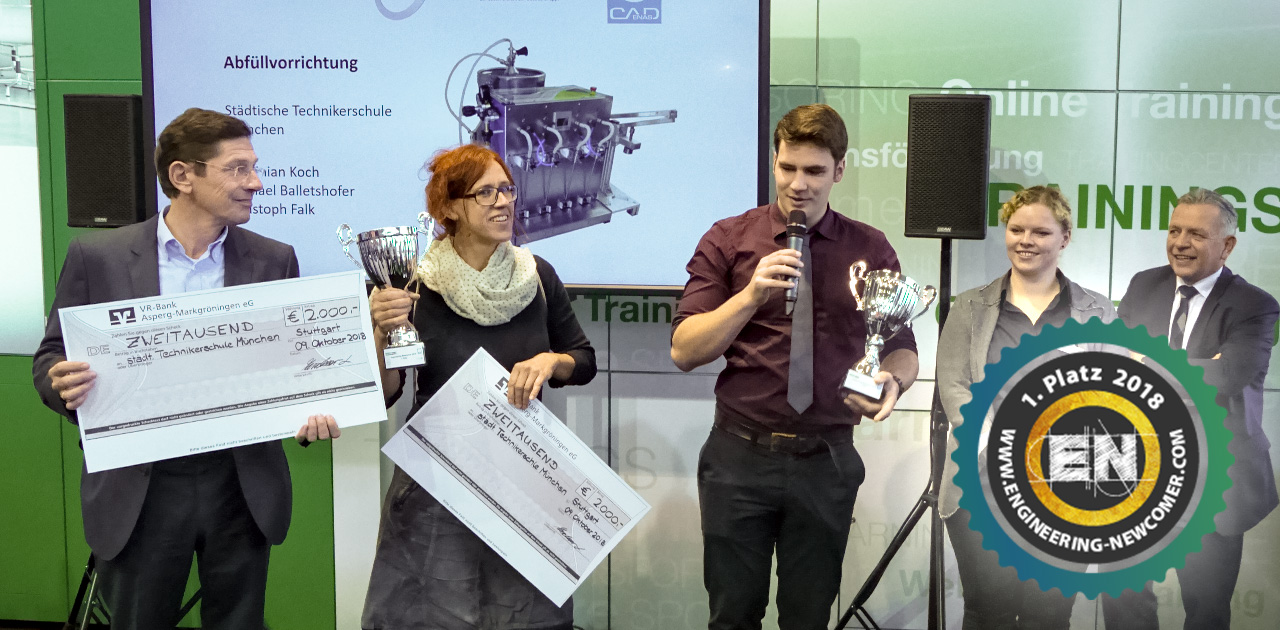Den 1. Platz sicherte sich das Team der Städtischen Technikerschule München rund um Michael Balletshofer, Christoph Falk und Korbinian Koch. Ihre entwickelte Abfüllvorrichtung überzeugte die Fachjury, da sich mit dieser vermeiden lässt, dass der Bodensatz des Gärprozesses bei der Abfüllung in die Flasche gelangt. Sowohl die drei Studenten als auch die betreuende Bildungseinrichtung konnten sich über jeweils 2.000 Euro freuen.