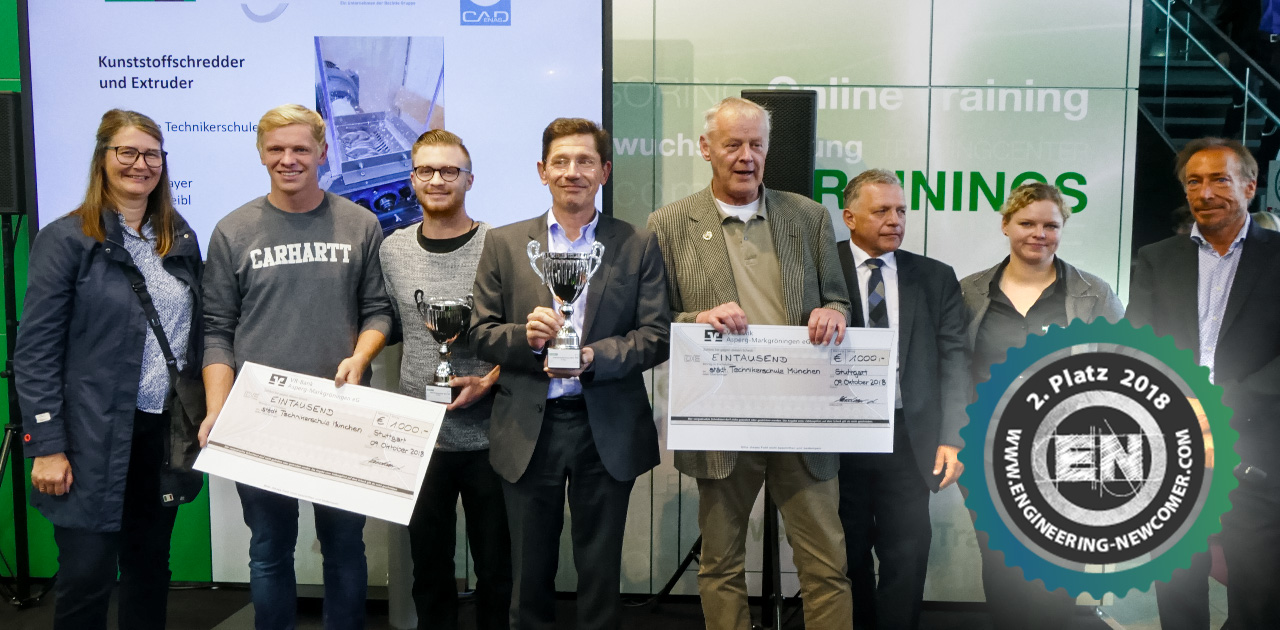 Der 2. Platz ging an Christoph Leibl und Dominic Mayer für ihren Kunststoff Schredder und Extruder. Die Studenten, ebenfalls von der Städtischen Technikerschule München, präsentierten mit ihrer Projektarbeit einen Lösungsansatz, wie der zunehmenden Verschmutzung der Weltmeere durch Kunststoffabfall durch Wiederverwendung entgegengewirkt werden könnte. Der von ihnen entwickelte Schredder zerkleinert Plastikmüll und erhitzt es anschließend im Extruder, bis daraus ein wiederverwertbares Kunststofffilament für den 3D Druck entsteht. Der Einsatz wurde mit 1.000 Euro sowohl für die Nachwuchsingenieure als auch für die Bildungsreinrichtung belohnt.