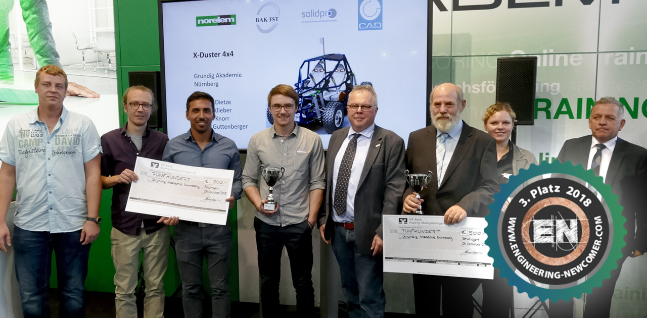 Das Team von Tobias Guttenberger, Patrick Klieber, Bastian Knorr und Marcus Dietze von der GRUNDIG AKADEMIE - Fachschule für Technik in Nürnberg belegte mit ihrer Projektarbeit „X-Duster“ den 3. Platz beim Engineering Newcomer 2018. „In der Schule wurden wir auf den Wettbewerb aufmerksam gemacht – unser Interesse war sofort geweckt und wir haben diese Herausforderung angenommen“, so das Team. Ihre Konstruktion eines Wüstenbuggys für den Offroad-Bereich mit über 1230 Einzelteilen überzeugte die Fachjury. Die Drittplatzierten konnten sich über 500 Euro freuen. Ebenfalls mit 500 Euro honoriert wurde die betreuende Bildungseinrichtung.